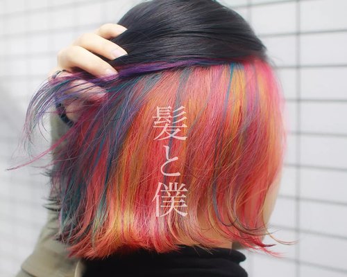 染发不一定要显露在外侧,女生圆脸型内扣染发发型设计,发顶上的头发是烟黑色的染发,脖颈位置的头发做了翘起来的碎发,女生圆脸型染发发型设计,有挑染搭配,也有火焰一样的出众。